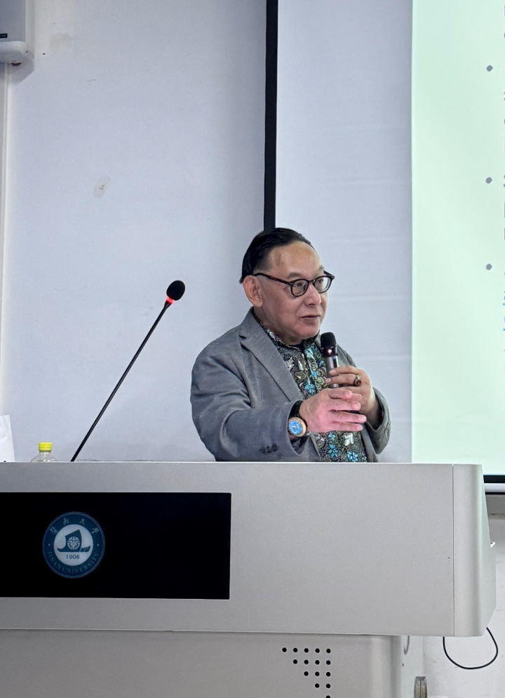 12月4日,主题为“理解印尼外交”的专题讲座在我院举行。本次讲座荣幸邀请到印尼资深退休外交官、智库学者皮皮恩·伦戈诺·埃卡·普里亚特纳(Pipien Lenggono Eka Priatna)先生担任主讲。凭借长达33年的外交经历,普里亚特纳为我院师生带来了一场思想深邃、数据翔实且富有启发性的精彩分享。讲座由暨南大学国际关系学院/华侨华人研究院副教授、暨南大学印尼研究中心主任李皖南主持。